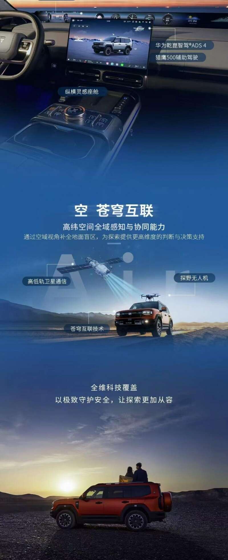 纵横GAIA全领域智控系统空域高纬感知能力的布局,则为越野探索补上了关键的高维视角,通过卫星通信、无人机协同等技术构建起全域感知体系,为车辆的全领域探索提供更高维度的决策支撑,让越野探索的安全性与边界感实现双重升级。