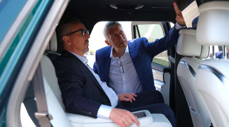 宝马集团负责研发的董事普斯特(左一)正在试乘坦克700车型,并与团队成员交流。长城汽车供图