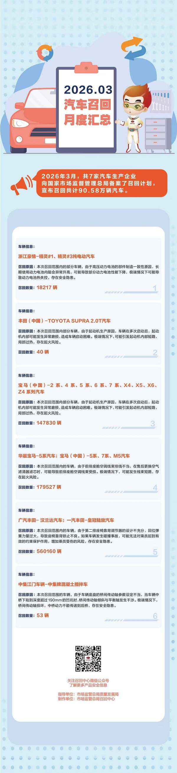 中新经纬4月7日电 国家市场监管总局网站7日披露《2026年3月汽车召回月度汇总》指出,2026年3月,共7家汽车生产企业向国家市场监督管理总局备案了召回计划,宣布召回共计90.58万辆汽车。