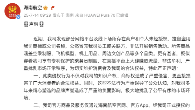 7月14日,海南航空发布声明称,近期发现部分网络平台及线下场